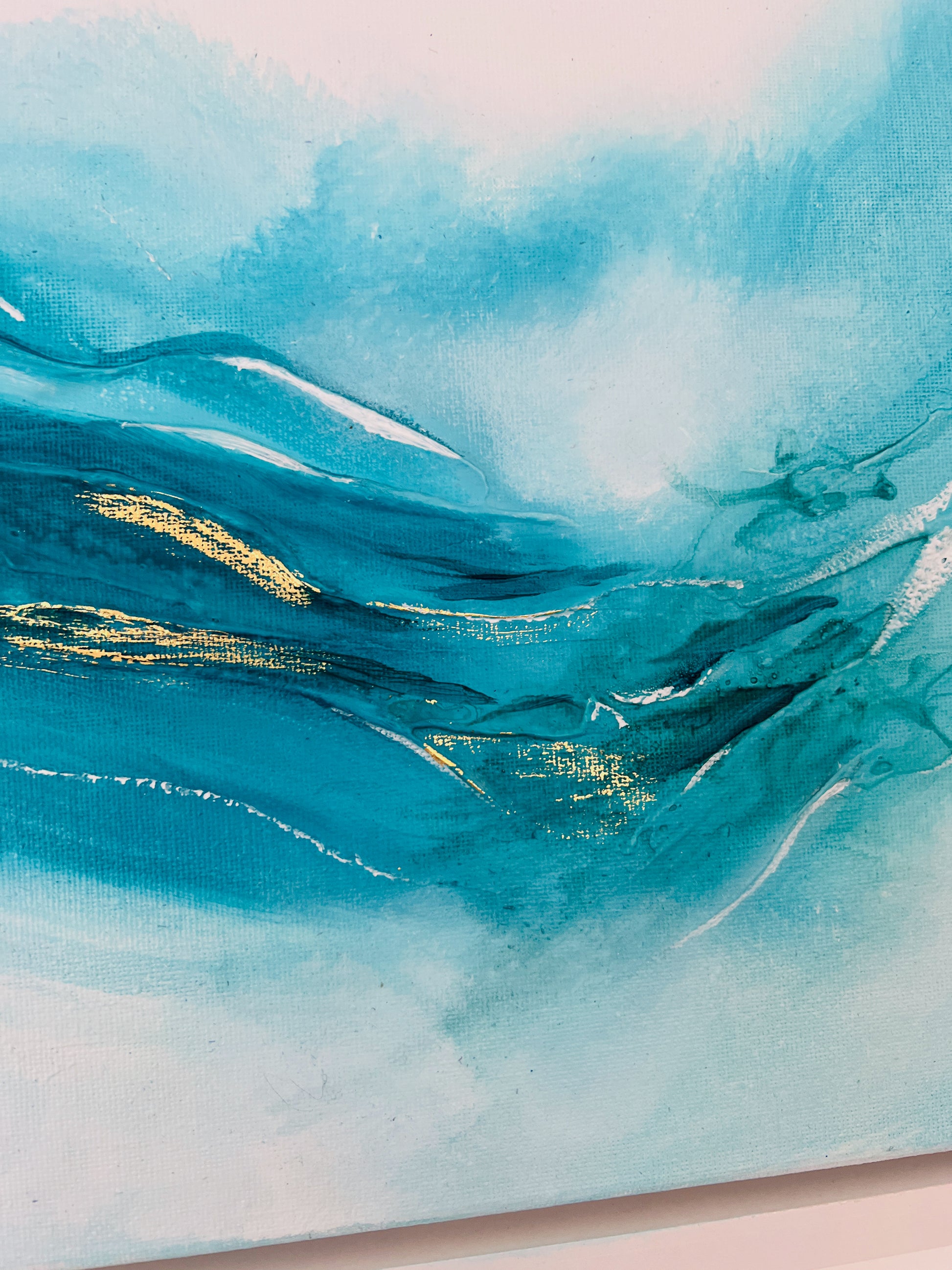 This abstract artwork invites you into a serene world of fluid blues and gentle textures. The sweeping lines and soft gradients evoke the calming essence of water, while subtle hints of gold add a touch of warmth and depth. Each layer reveals a new dimension, encouraging a moment of reflection and tranquility. Perfect for brightening up your space, this piece effortlessly blends with various decor styles, making it a delightful addition to any room.