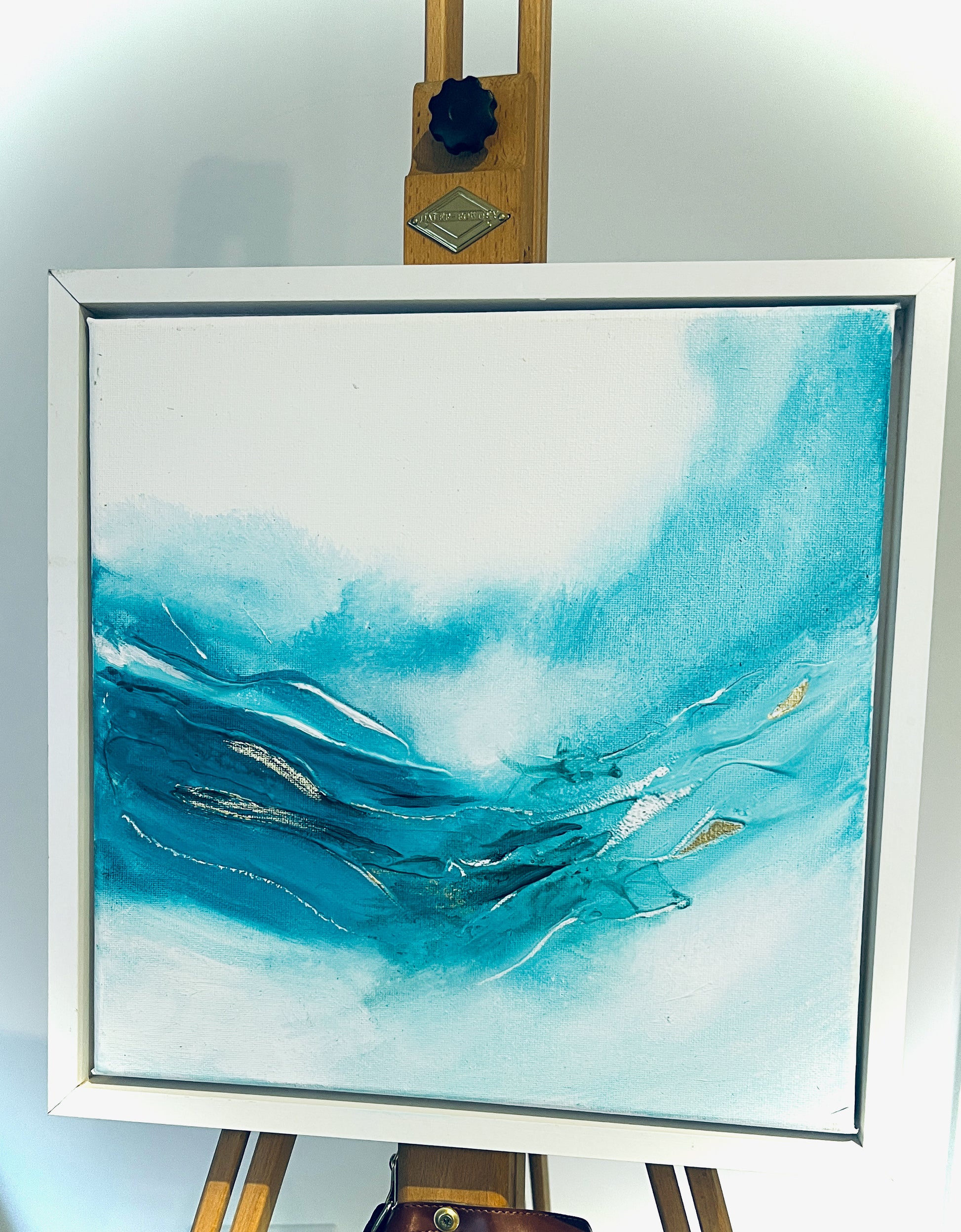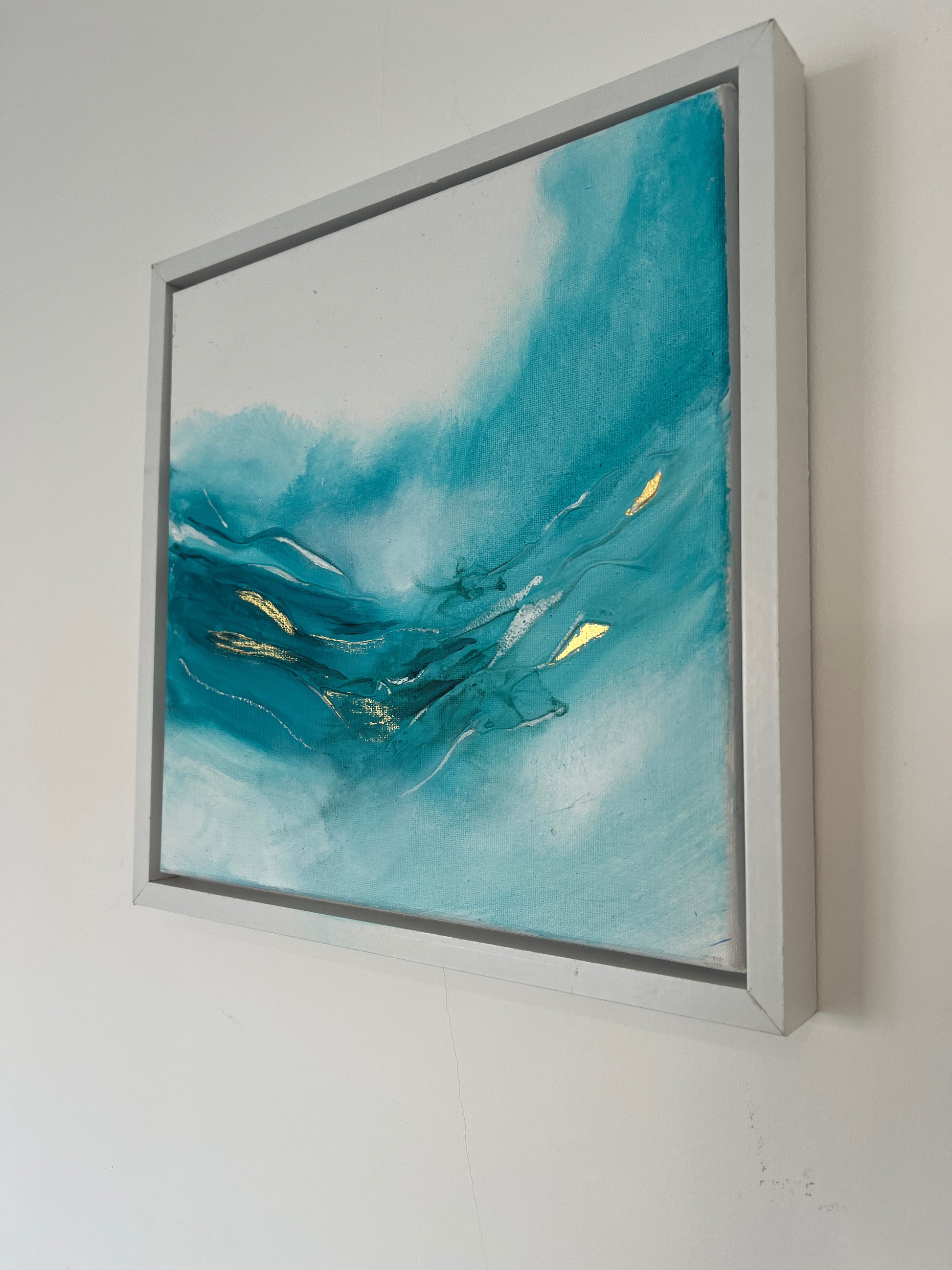 arcylic and gold leaf highlights on canvas set in a white floater frame . UV varnished