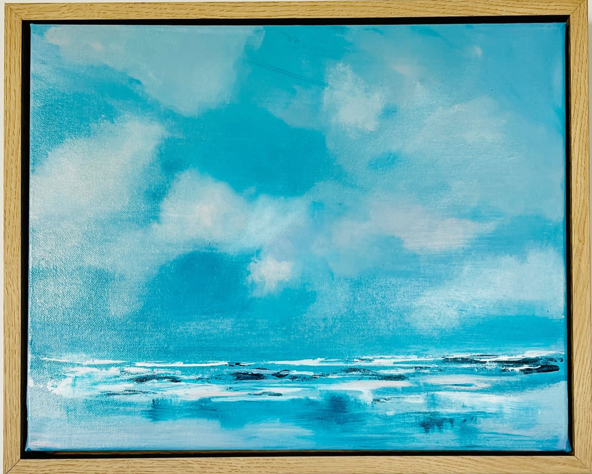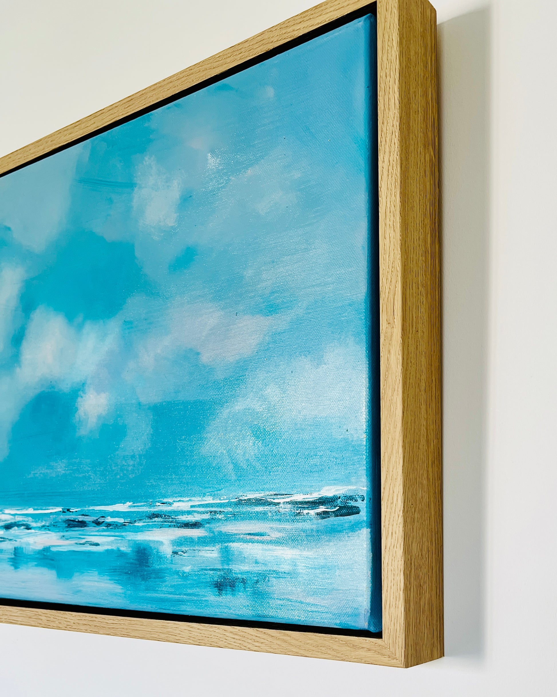 Original acrylic on cotton canvas 50cm x40cm , in a oak effect deep floater frame with UV varnish and signed on the back , including a certificate of authentication